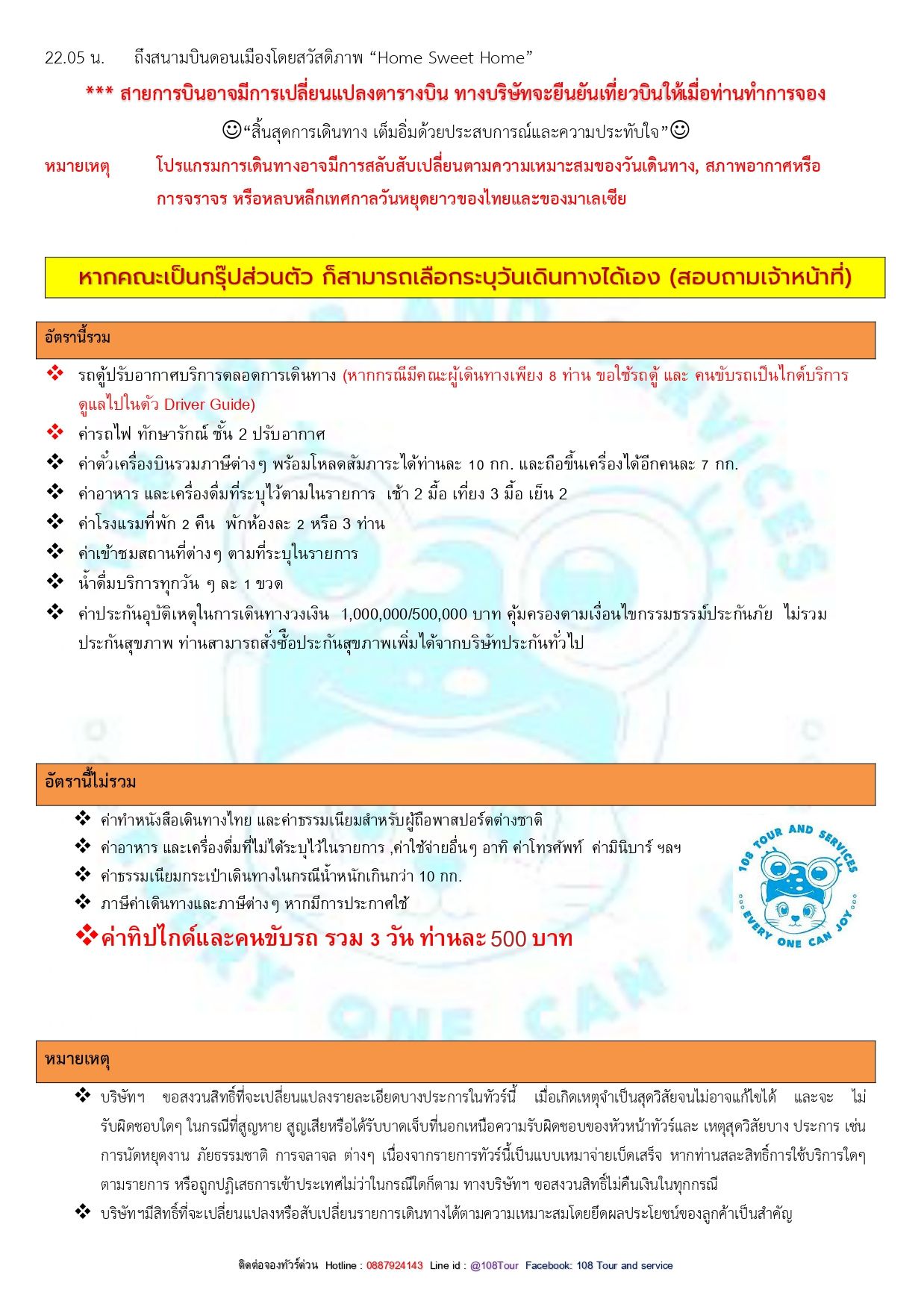 - ยังไม่รวมค่าทิปสำหรับมัคคุเทศก์,พนักงานขับรถ และหัวหน้าทัวร์ รวมท่านละ 500 บาท ตลอดทริปการเดินทาง